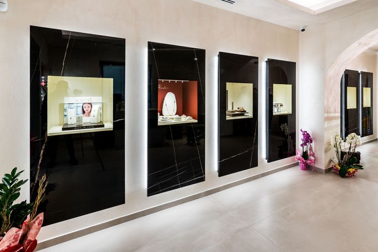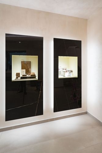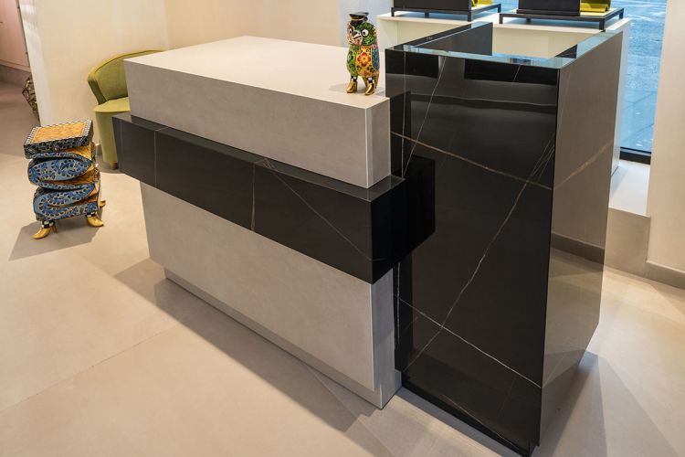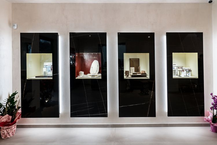 Le vetrine e gli arredi sono realizzati invece con la collezione Marble Experience, colore "Sahara Noir", spessore 6mm.