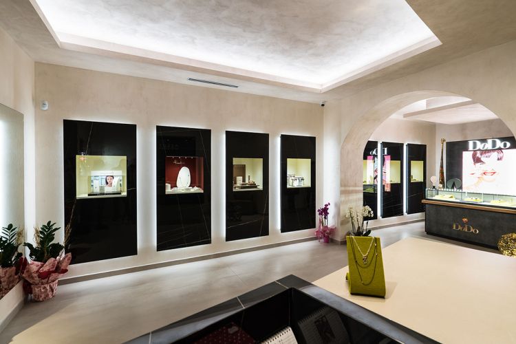 Per questo progetto di gioielleria monomarca e rivenditore autorizzato *DoDo e Pomellato, "Tuzza Preziosi" ha scelto come pavimentazione "Metaline", gres porcellanato effetto cemento-metallo dal gusto moderno ed elegante.