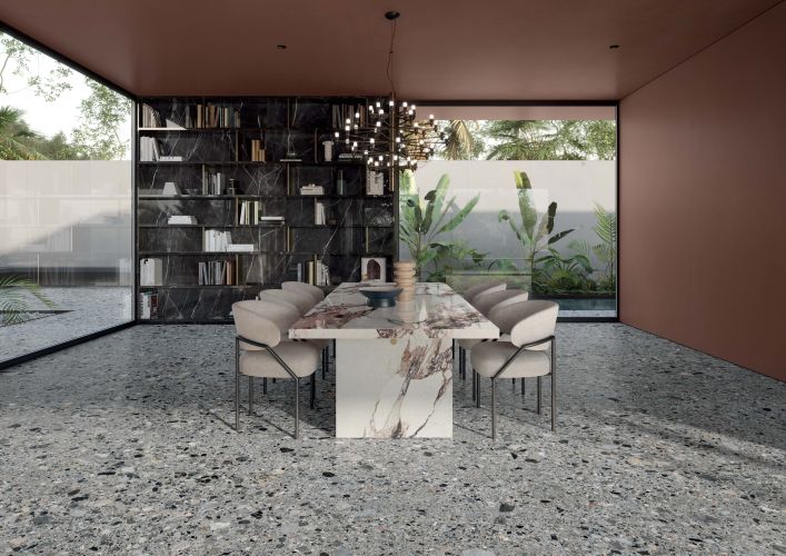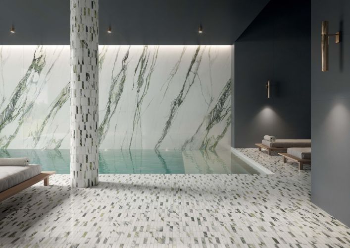 I lussuosi marmi ceramici di Charm Experience sono in totale sintonia con le tinte unite Nuances: due estetiche che si completano a vicenda, accomunate da numerosi rimandi cromatici.