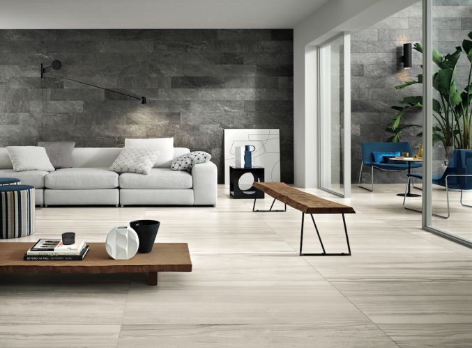 La monumentale bellezza della pietra viene reinterpretata in questo progetto in gres porcellanato Italgraniti in cui il design incontra la natura.