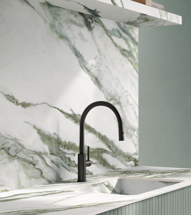 Le superfici dedicate ai piani lavoro sono coordinate dalle lastre super sottili in spessore 6 mm. Questo innovativo programma consente il rivestimento di ante, cassetti, mobili giorno e complementi d’arredo. Italstone regala allo spazio un’incredibile precisione estetica, un continuum architettonico che non pone limiti progettuali.