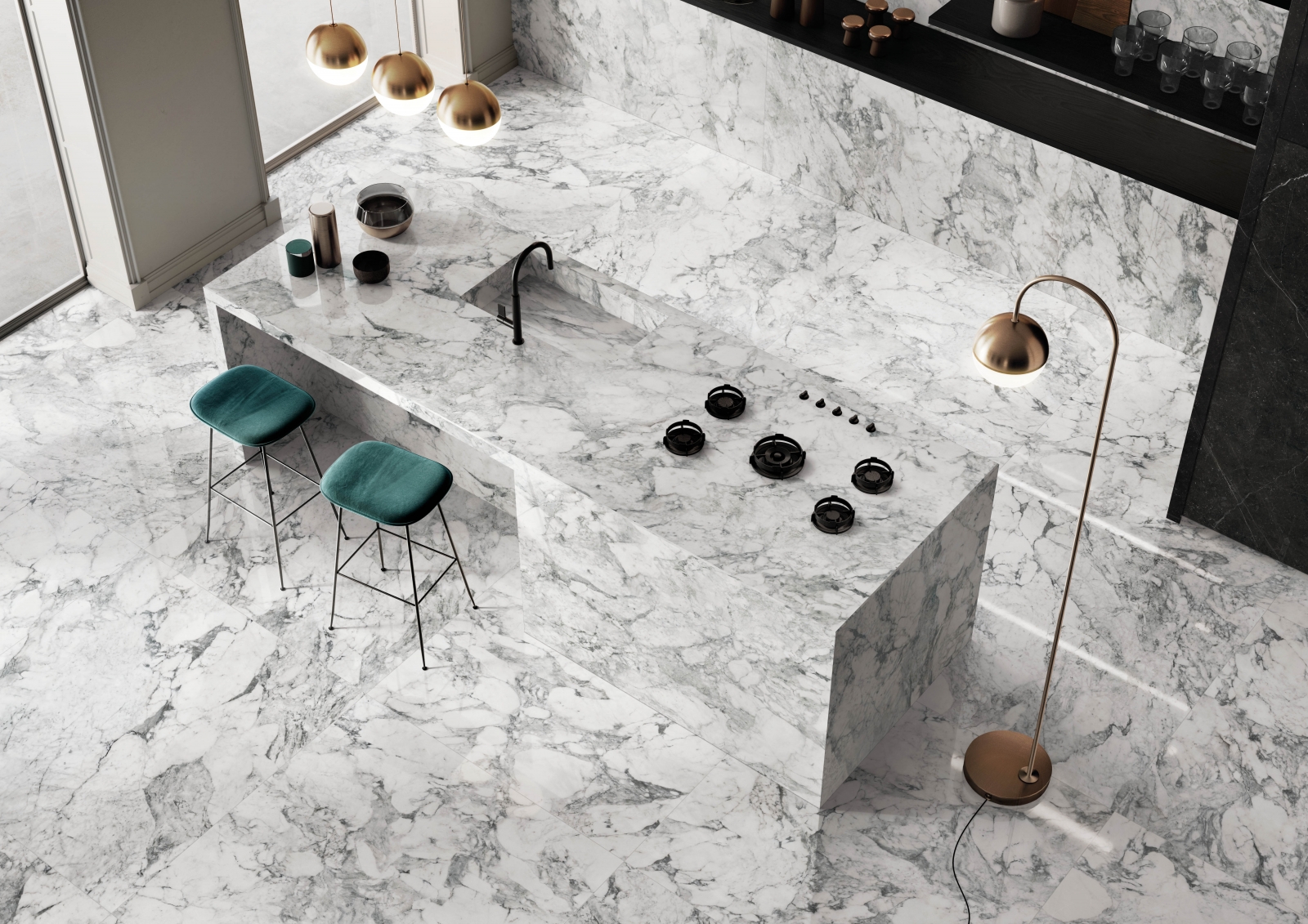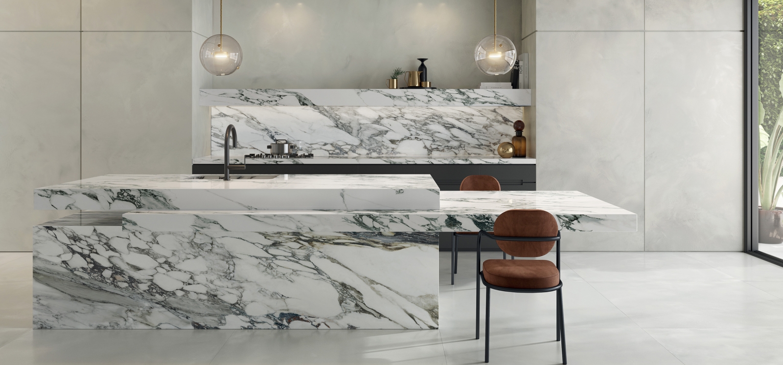 Ad accogliere il pubblico ci sarà il progetto di grandi lastre Nuances, spessore 6 mm, declinate in mobili e complementi d’arredo, tavoli, piani lavoro, top cucina e molto altro, ricreando un ambiente dal forte impatto scenografico, senza porre alcun limite alla libertà espressiva.